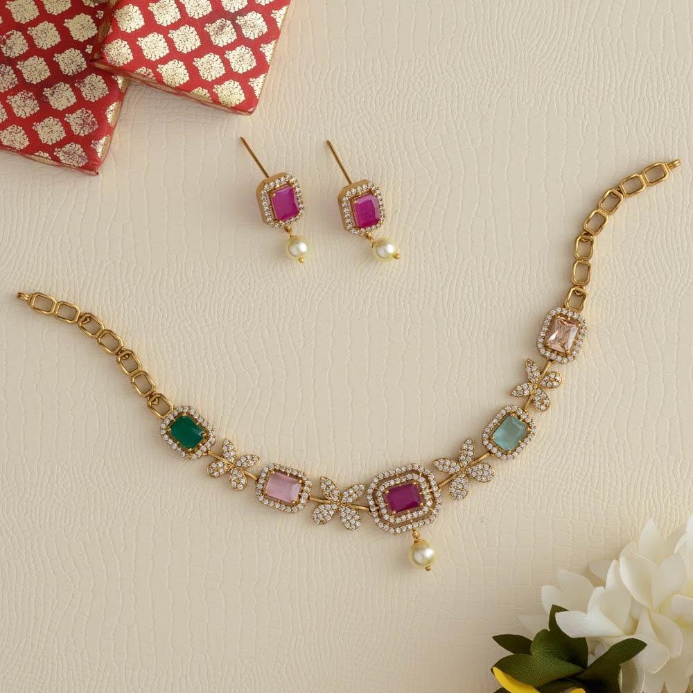 antique gold finished american diamond multi coloured stone worked party wear neckpiece set
