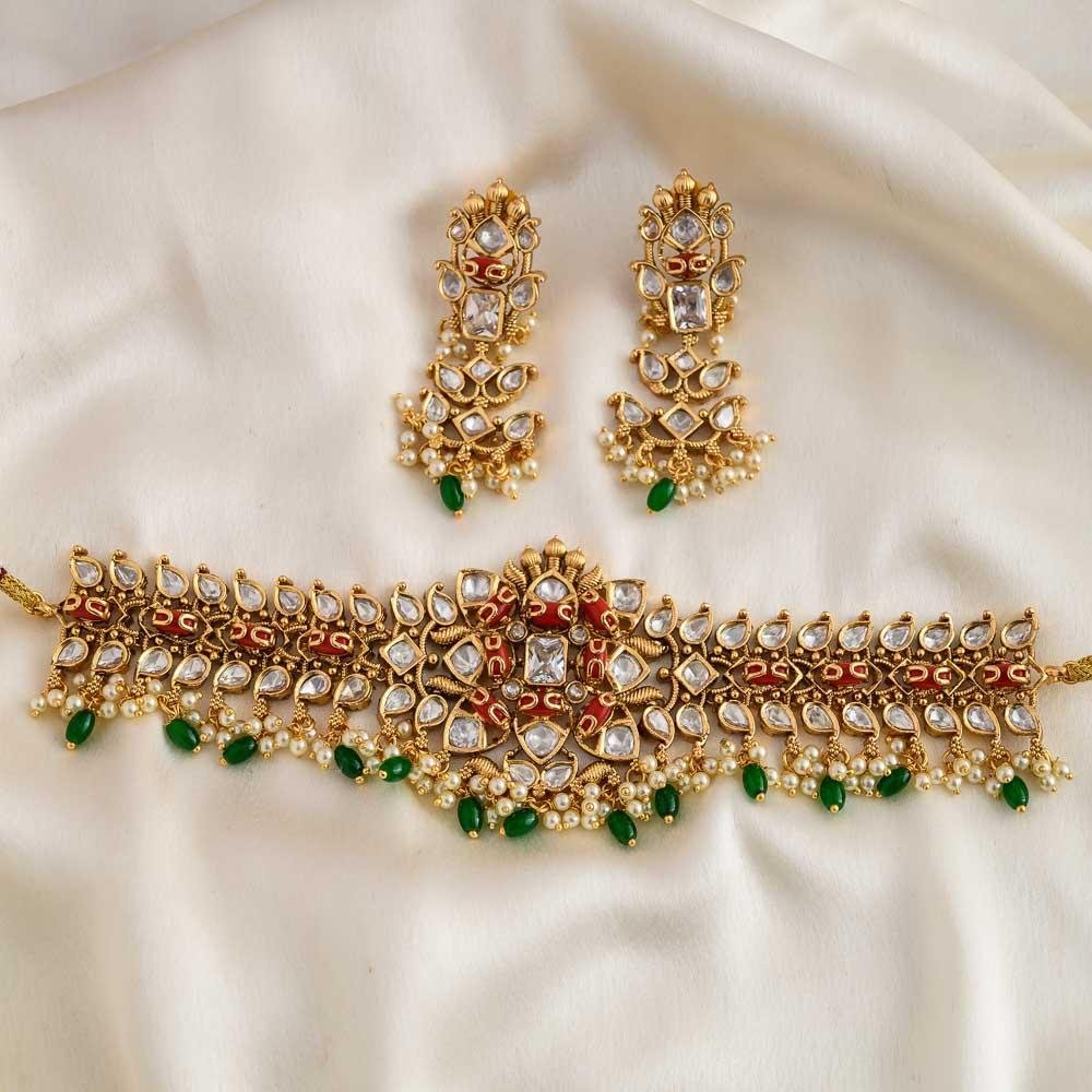 antique gold finished premium and exquisite reverse white stone worked and coral red neck hugging cluster pearl and green beaded statement choker set