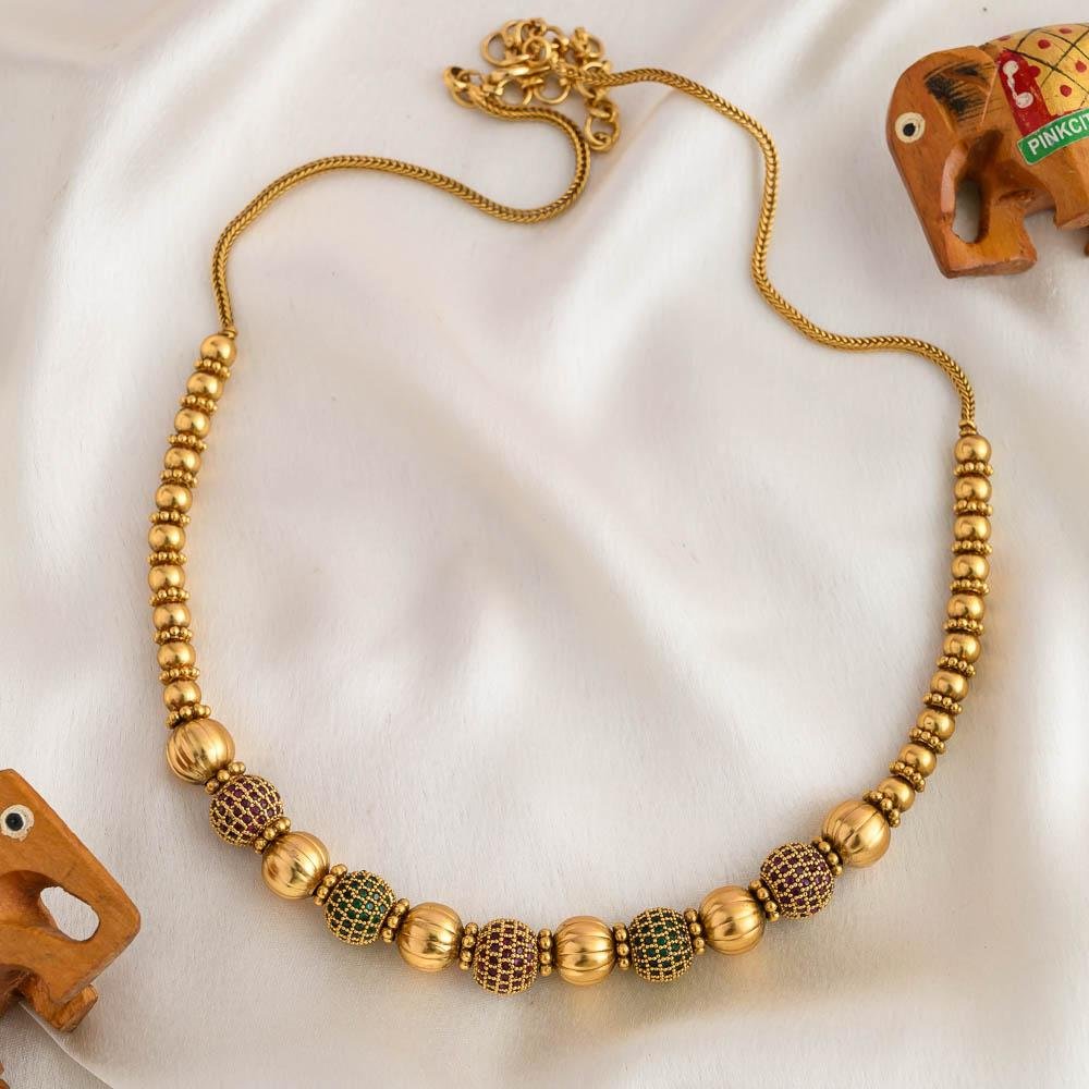 Antique gold finished real gold inspired ruby and green stone worked ball chain