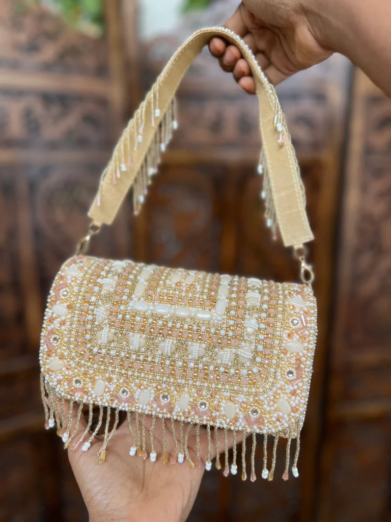 Add a touch of elegance to your special day with our exquisitely handcrafted bridal clutch bag. Designed with intricate detailing and premium craftsmanship, this clutch offers both style and versatility. The detachable handle allows you to carry it as a traditional clutch or wear it comfortably as a mini handbag, depending on your look.