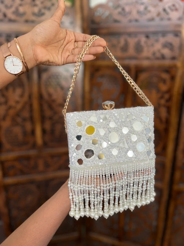 Add a touch of elegance to your special day with our exquisitely handcrafted bridal clutch bag. Designed with intricate detailing and premium craftsmanship, this clutch offers both style and versatility. The detachable handle allows you to carry it as a traditional clutch or wear it comfortably as a mini handbag, depending on your look.
