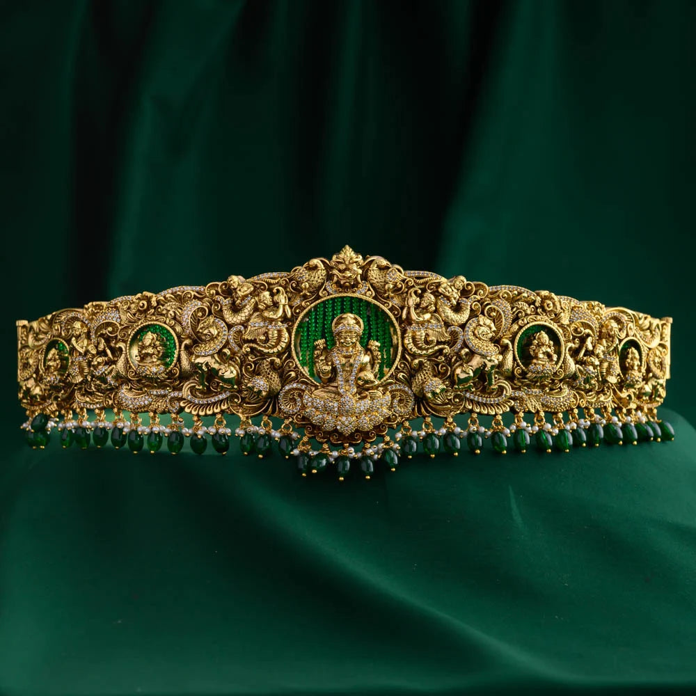 antique gold finished temple designer 3d pattern real gold inspired heavy stone worked bridal hipbelt size 32 to 40