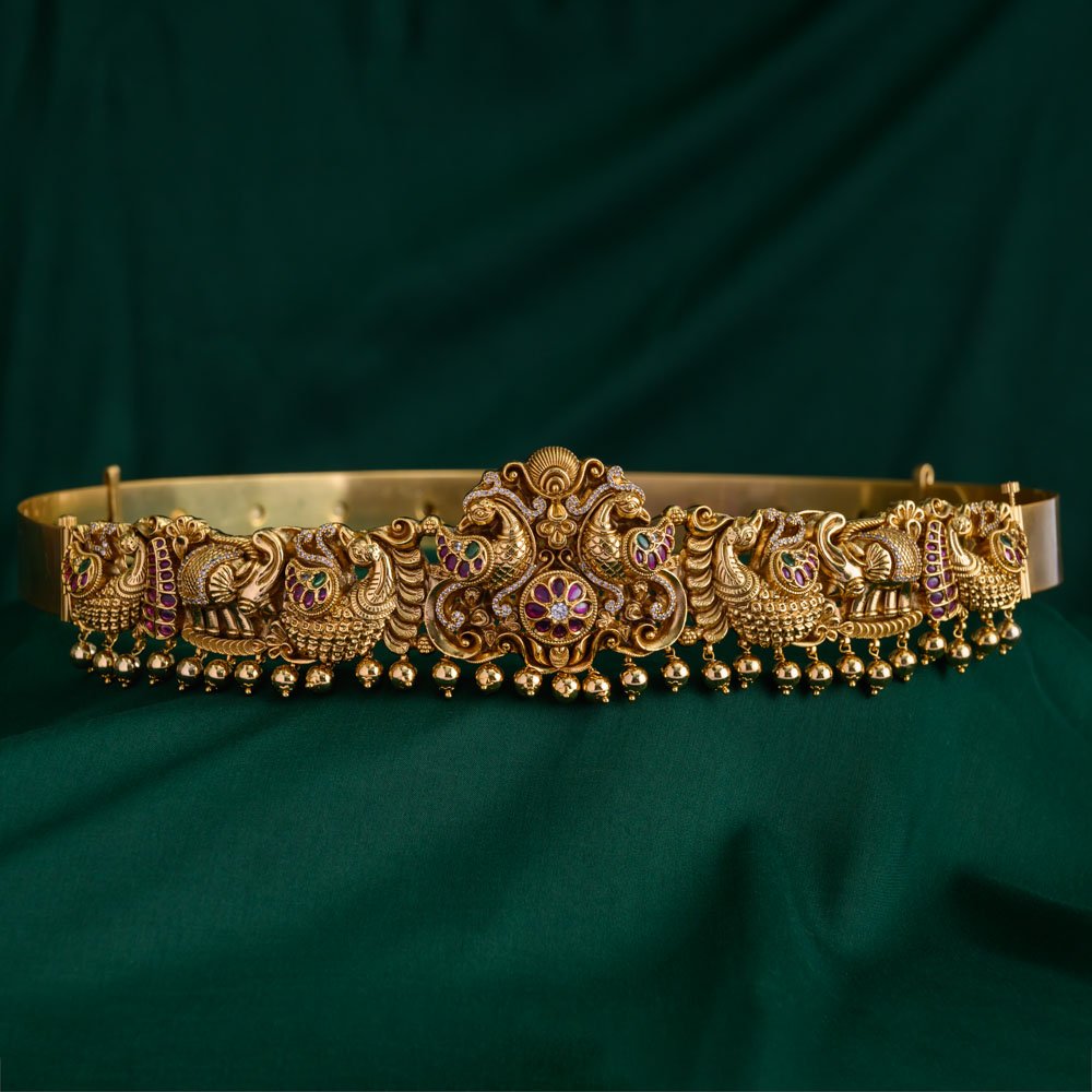antique gold finished temple designer 3d worked real gold inspired peacock, elephant and floral designed bridal hipbelt