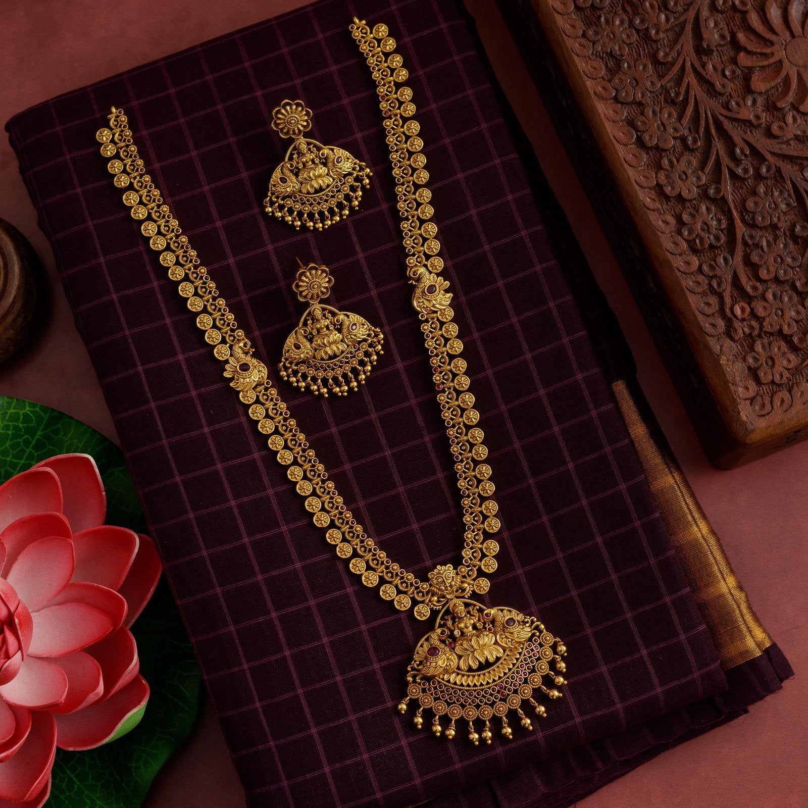 antique gold finished goddess lakshmi designed semi precious stoned gold look a like haaram set