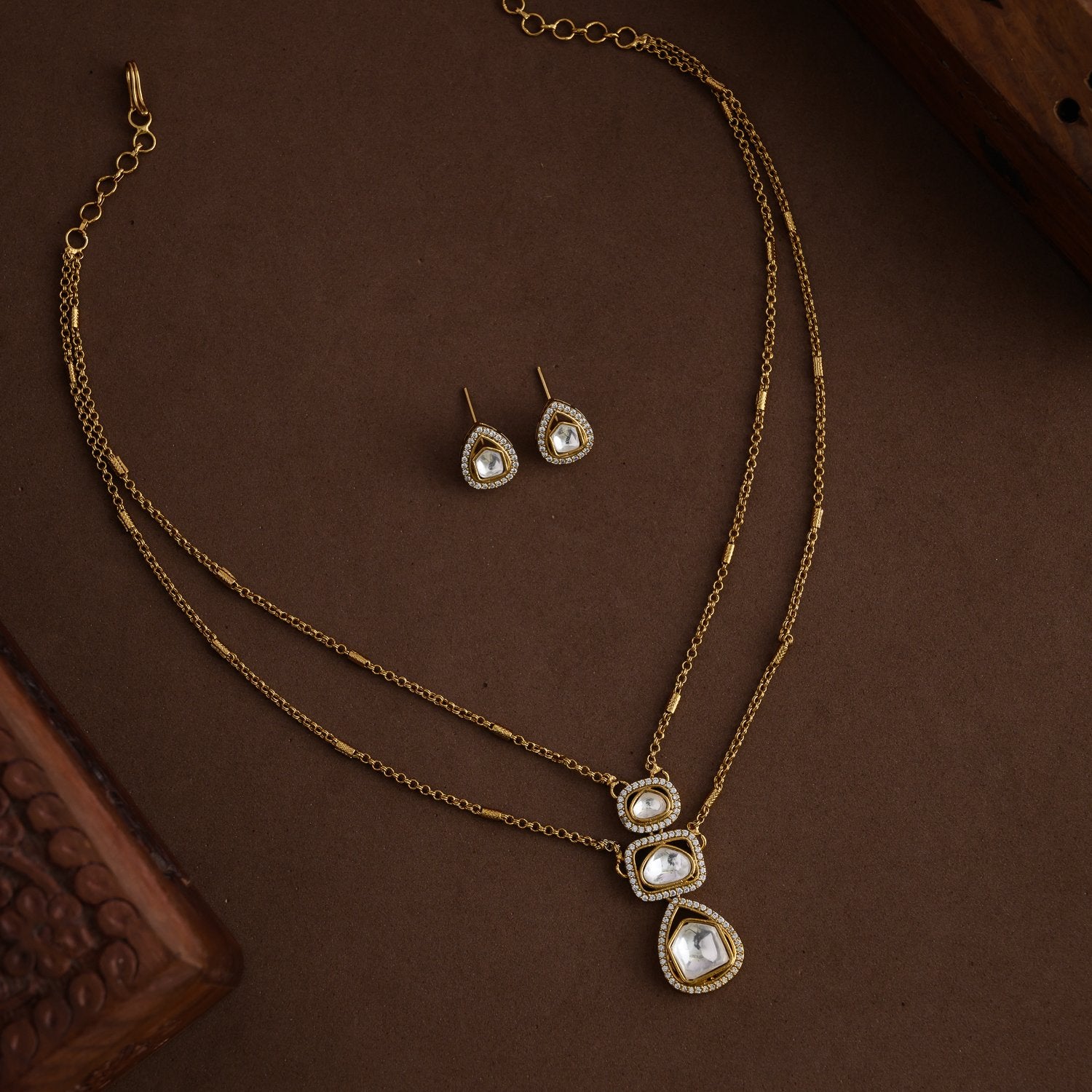 antique gold finished dual layered kundan , American diamond stone worked neck chain set comes with the earstud