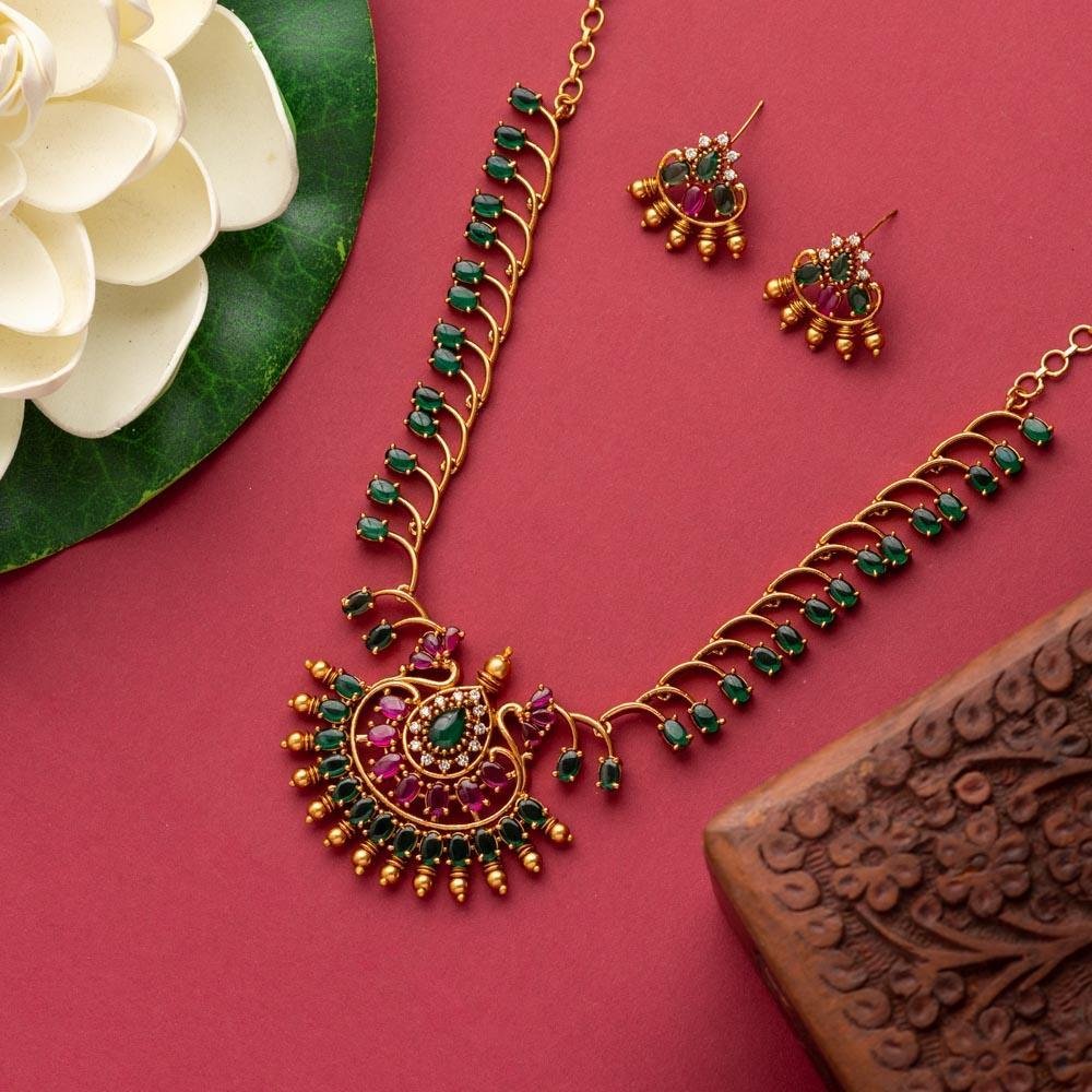 Matte gold finished emerold stoned floral designed neckpiece set