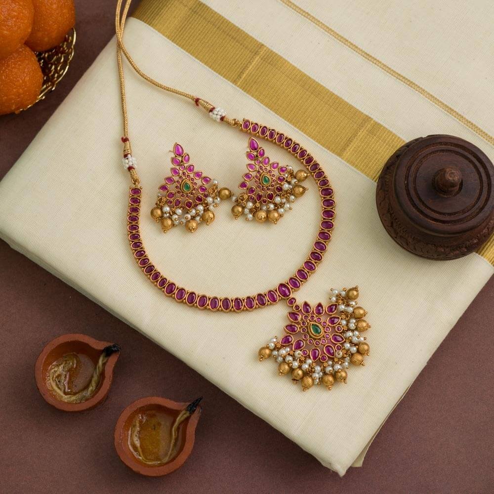 Matte gold finished floral designed ruby attigai neckpiece set.