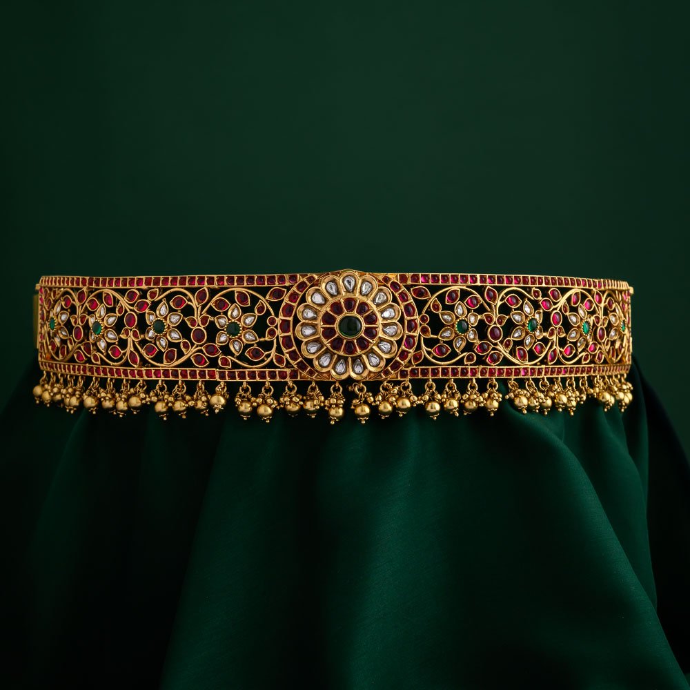 antique gold finished floral heavy kempu , kundan stone worked real gold replica cluster golden beaded bridal hipbelt
