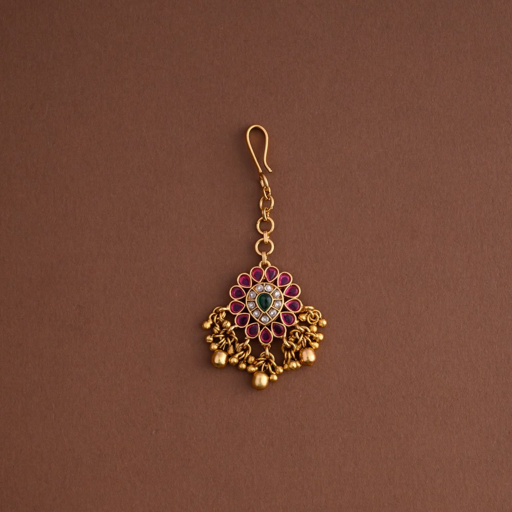 antique gold finished floral designed kempu and kundan stone worked maang tikka