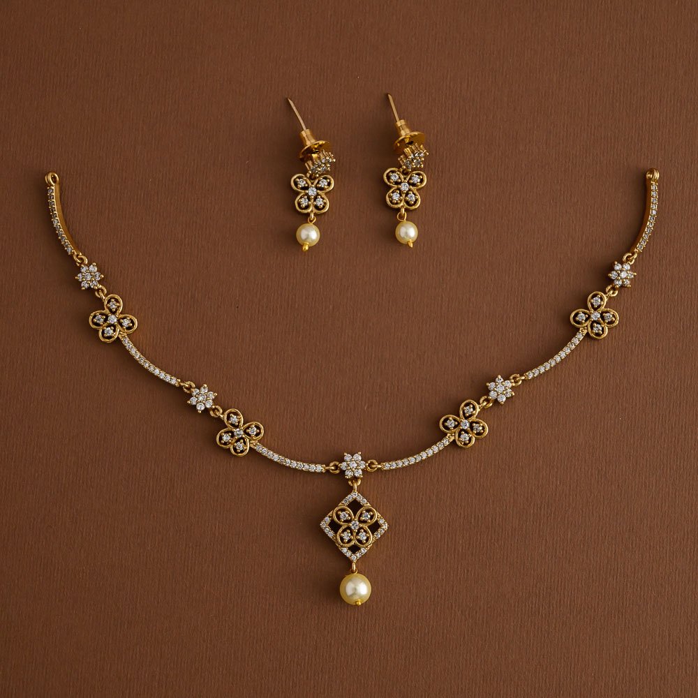 antique gold finished American diamond micro stone worked floral designed neckpiece set