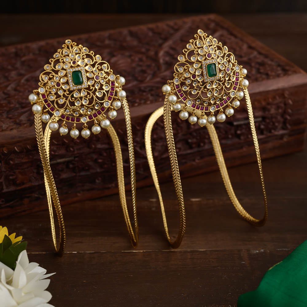 Antique gold finished American diamond micro stone worked ruby , emerald green and white and pearl worked adjustable adult sized vanki