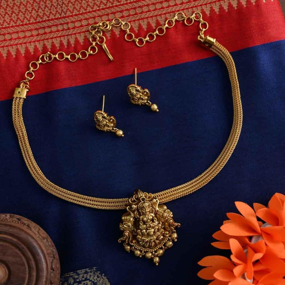 antique gold finished goddess lakshmi and elephant designed attigai chain set