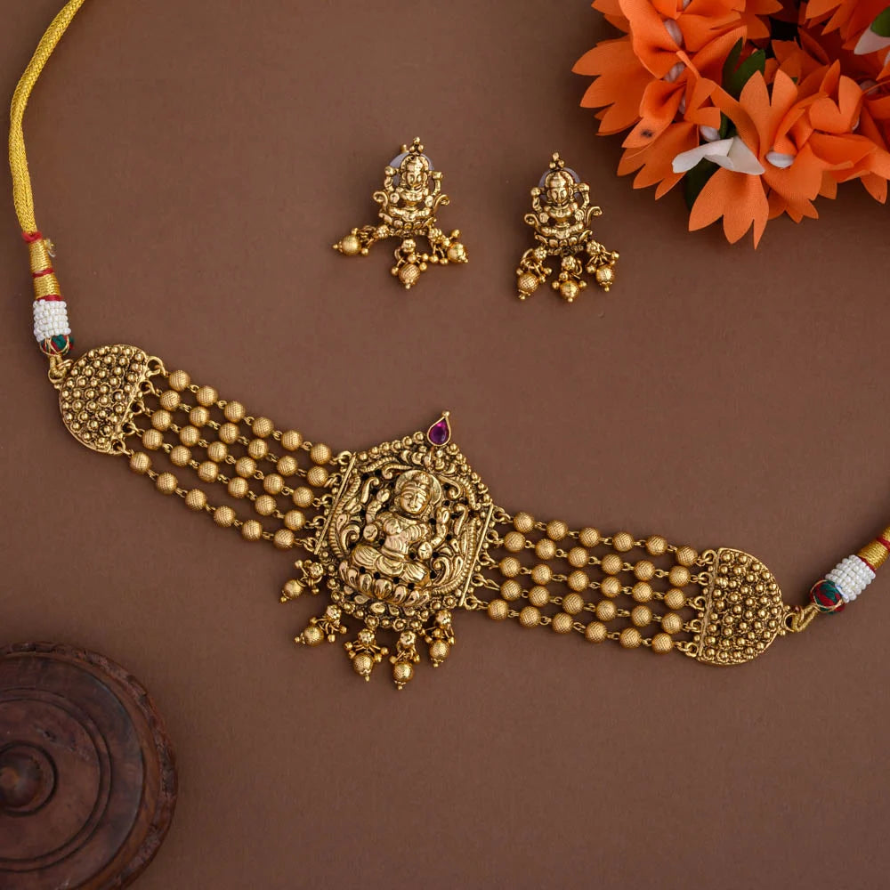 antique gold finished real gold inspired 3d goddess Lakshmi designed neck hugging bold statement choker