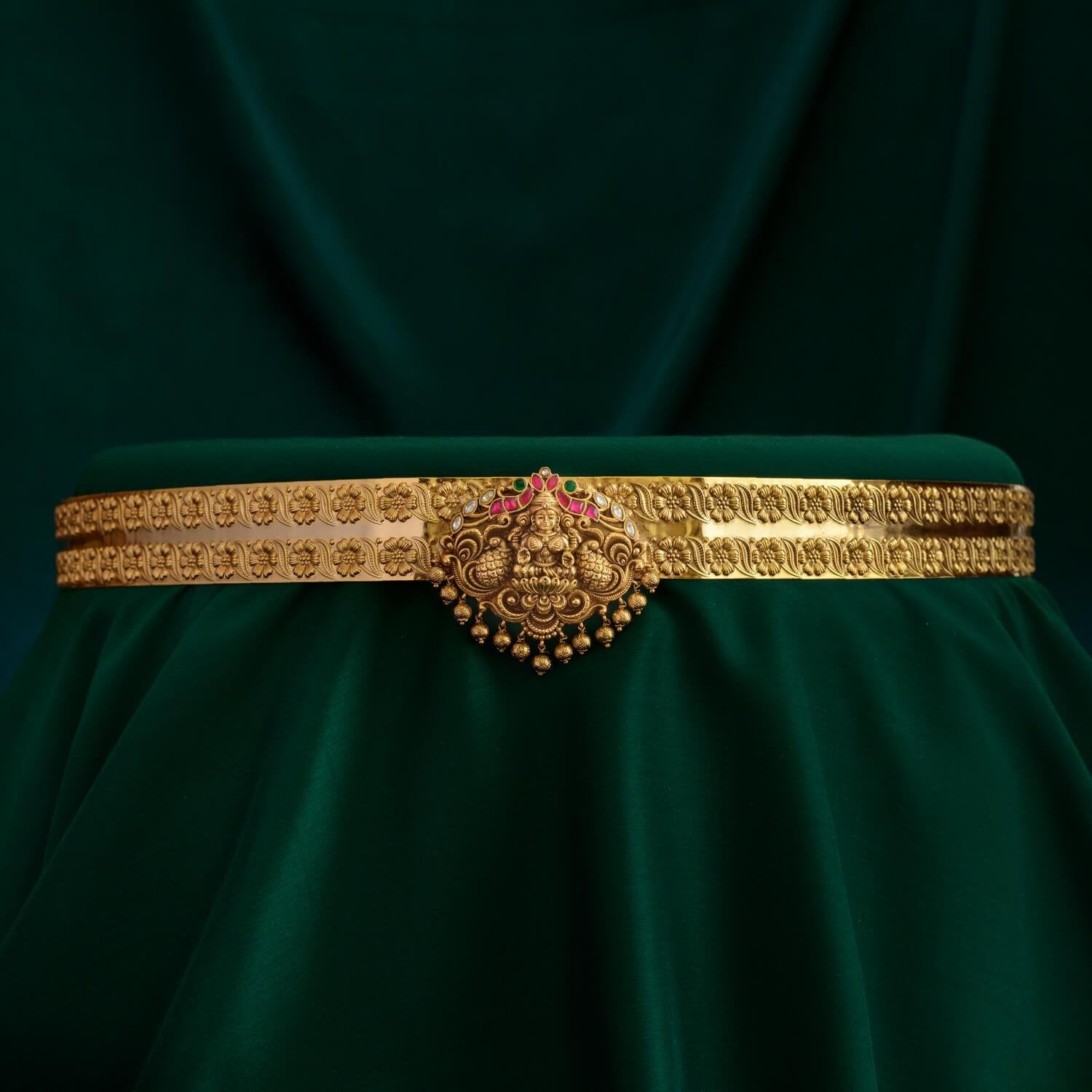 matte gold finished goddess lakshmi designed jadau nakshi temple gold bridal hipbelt size 32 to 40