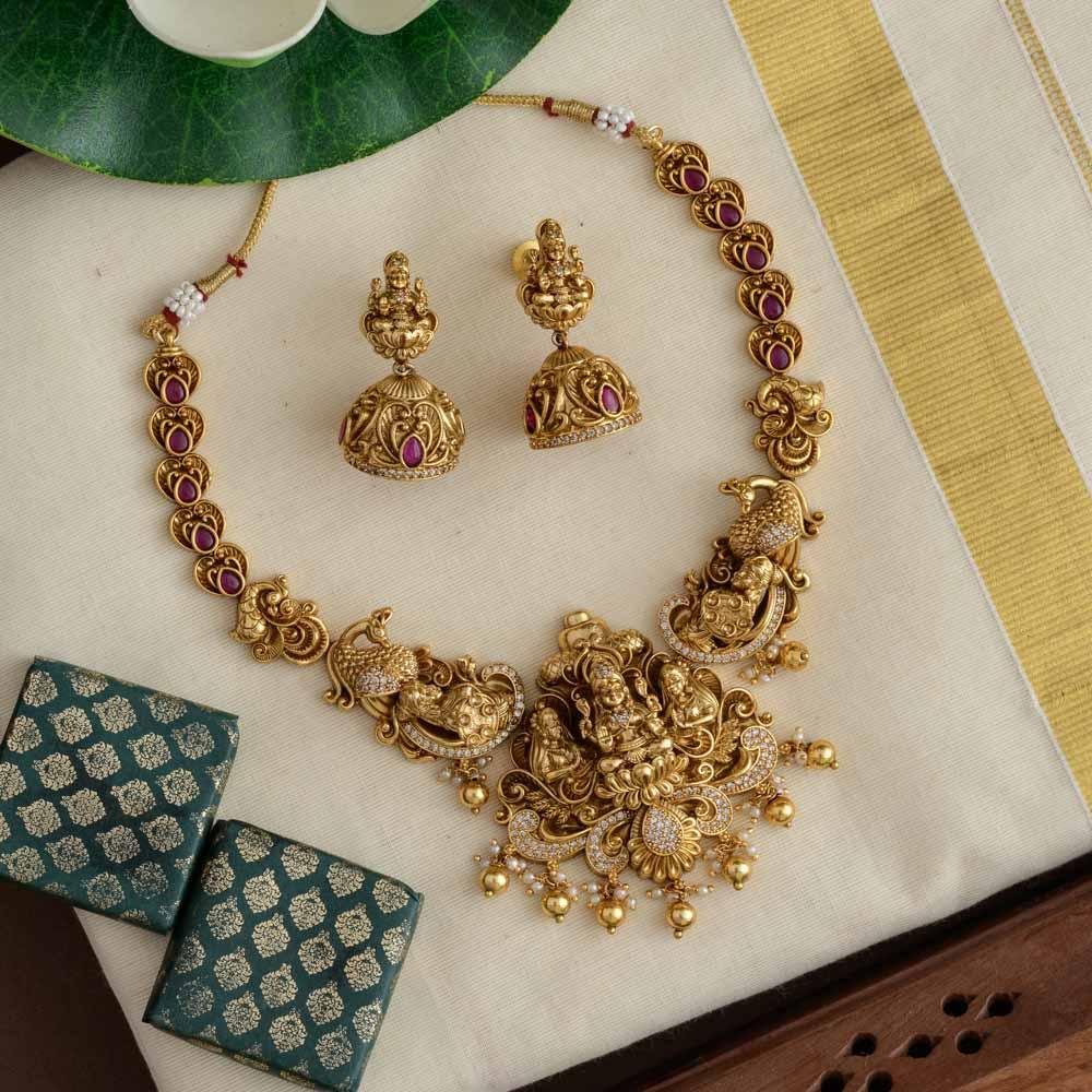 temple gold finished goddess lakshmi and peacock designed 3d pattern exquisite stone worked nagasi neckpiece set with jhumkas