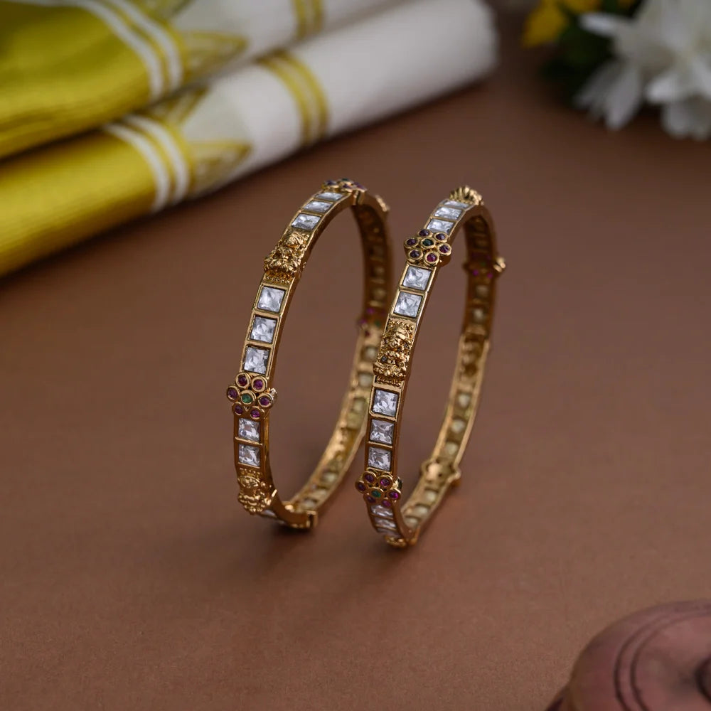 antique gold finished kundan stone worked floral and lakshmi designed bangles