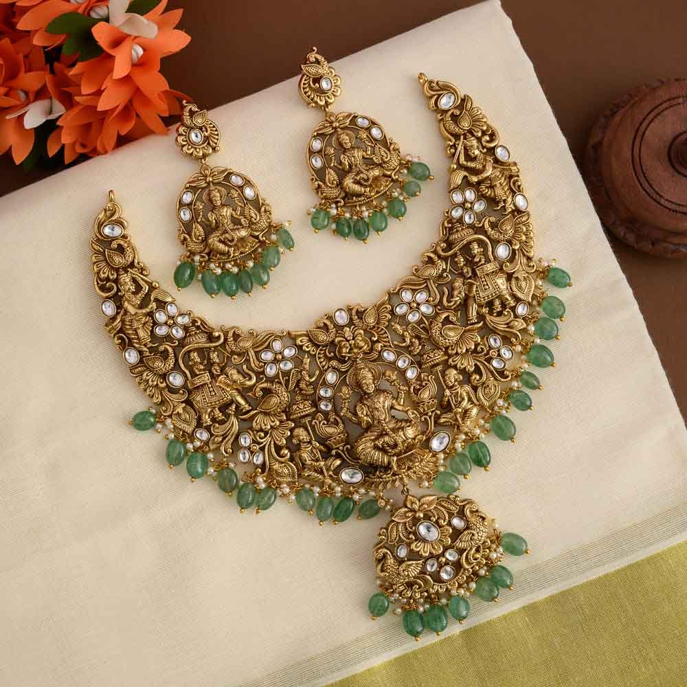 antique gold finished goddess Lakshmi real gold inspired 3d temple designer worked exquisite kundan stone worked bridal neckpiece set comes with the statement earrings.