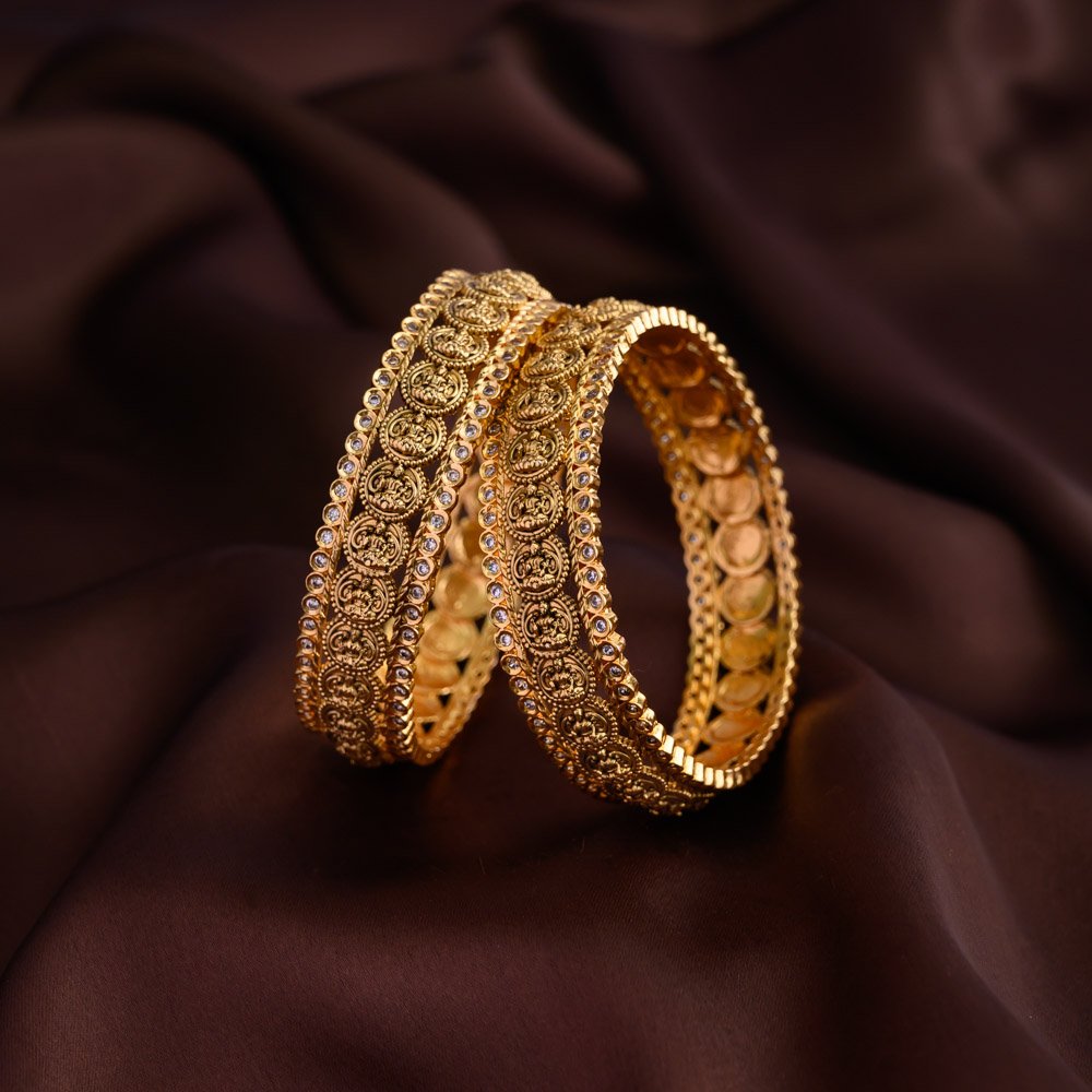 antique gold finished goddess Lakshmi coin designed American diamond micro stone worked bold bangles