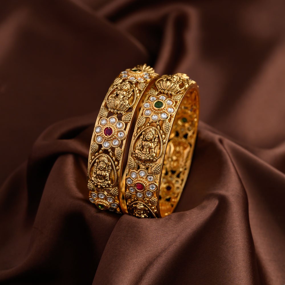 antique gold finished goddess lakshmi and floral designed bold 3d bangles