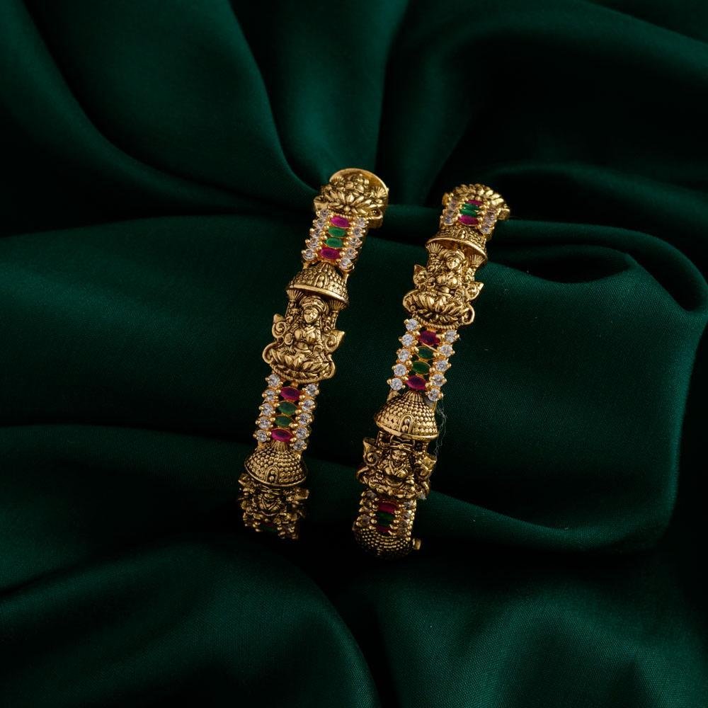 antique black gold finished goddess lakshmi designed ruby and green stone worked bangles