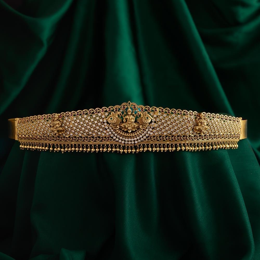antique gold finished real gold inspired goddess Lakshmi , peacock and kempu stone worked golden beaded bold bridal hipbelt