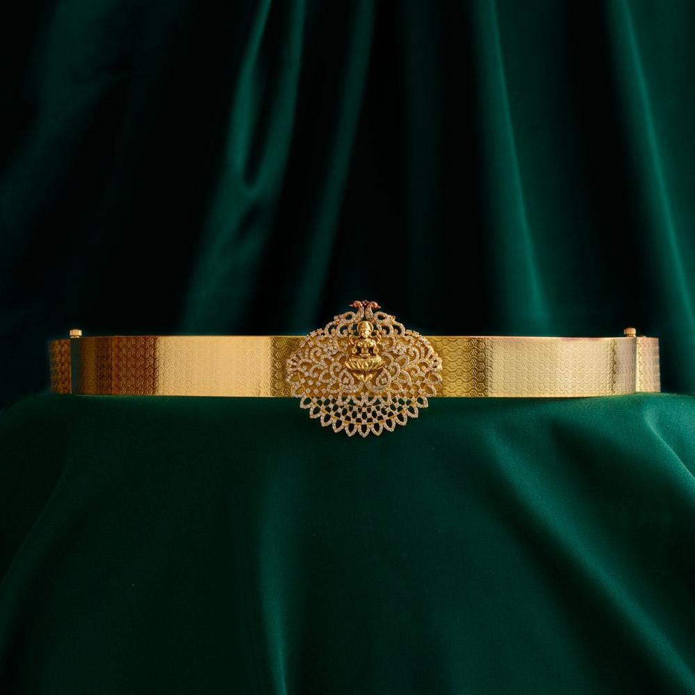 matte gold finished goddess lakshmi designed american diamond stone worked bridal hipbelt