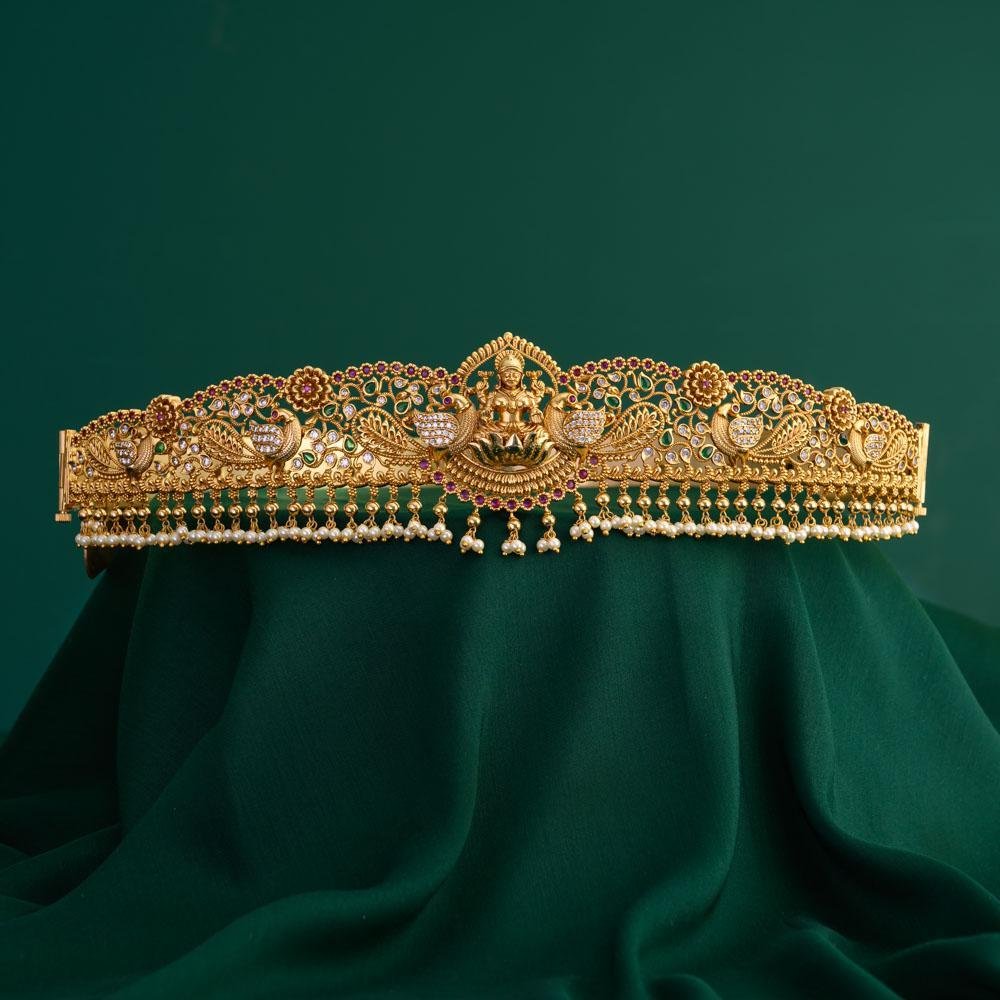 antique gold finished goddess lakshmi and peacock designed floral pattern exquisite heavy stone worked cluster pearl and golden beaded bridal hipbelt