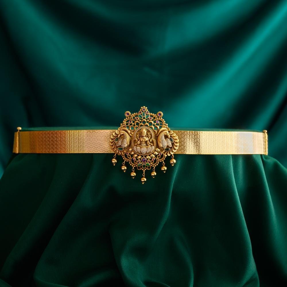 antique gold finished goddess Lakshmi and peacock designed golden beaded bridal hipbelt