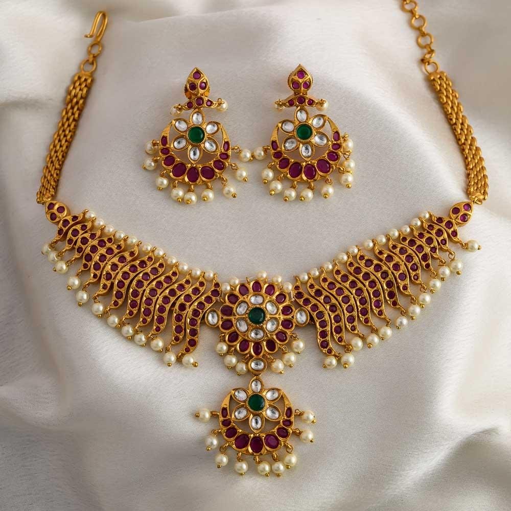 antique gold finished kempu floral stone worked neck hugging traditional choker set