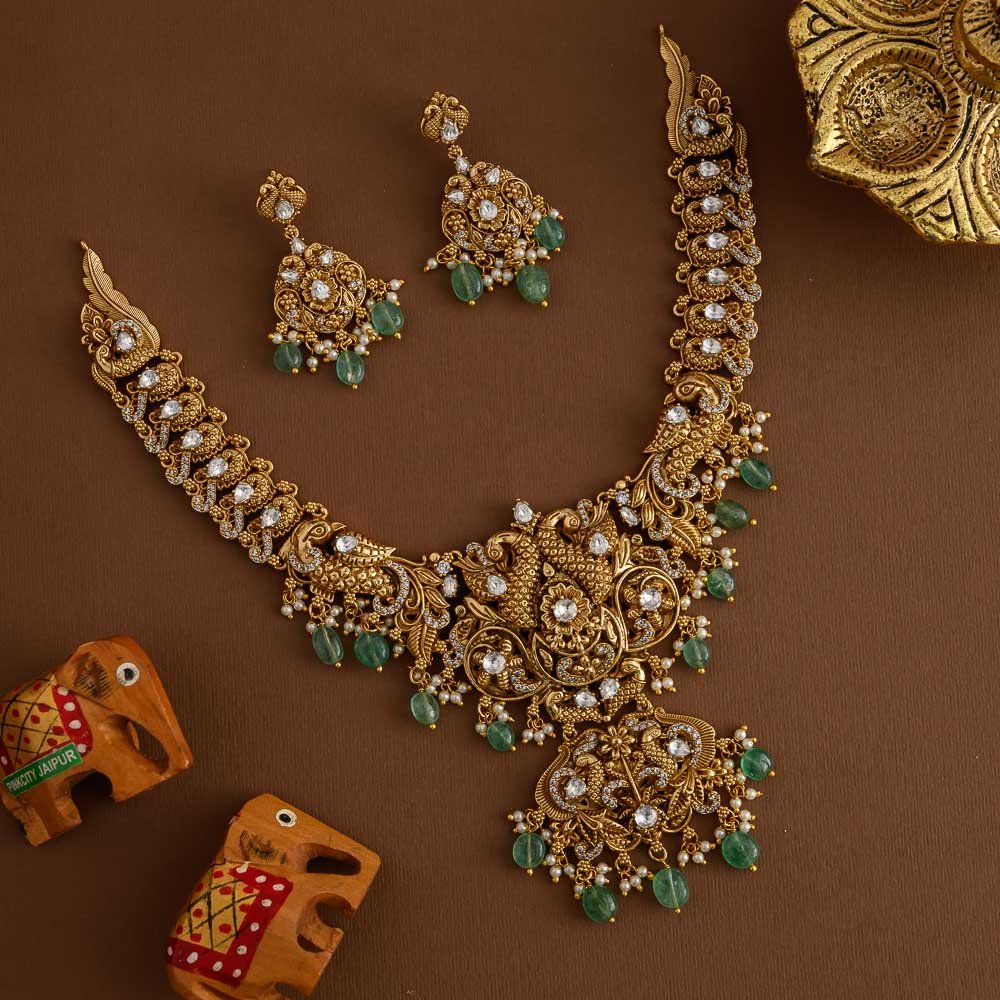 antique gold finished real gold inspired 3d worked premium and exquisite stone , cluster pearl beaded bridal neckpiece set comes with the statement earrings