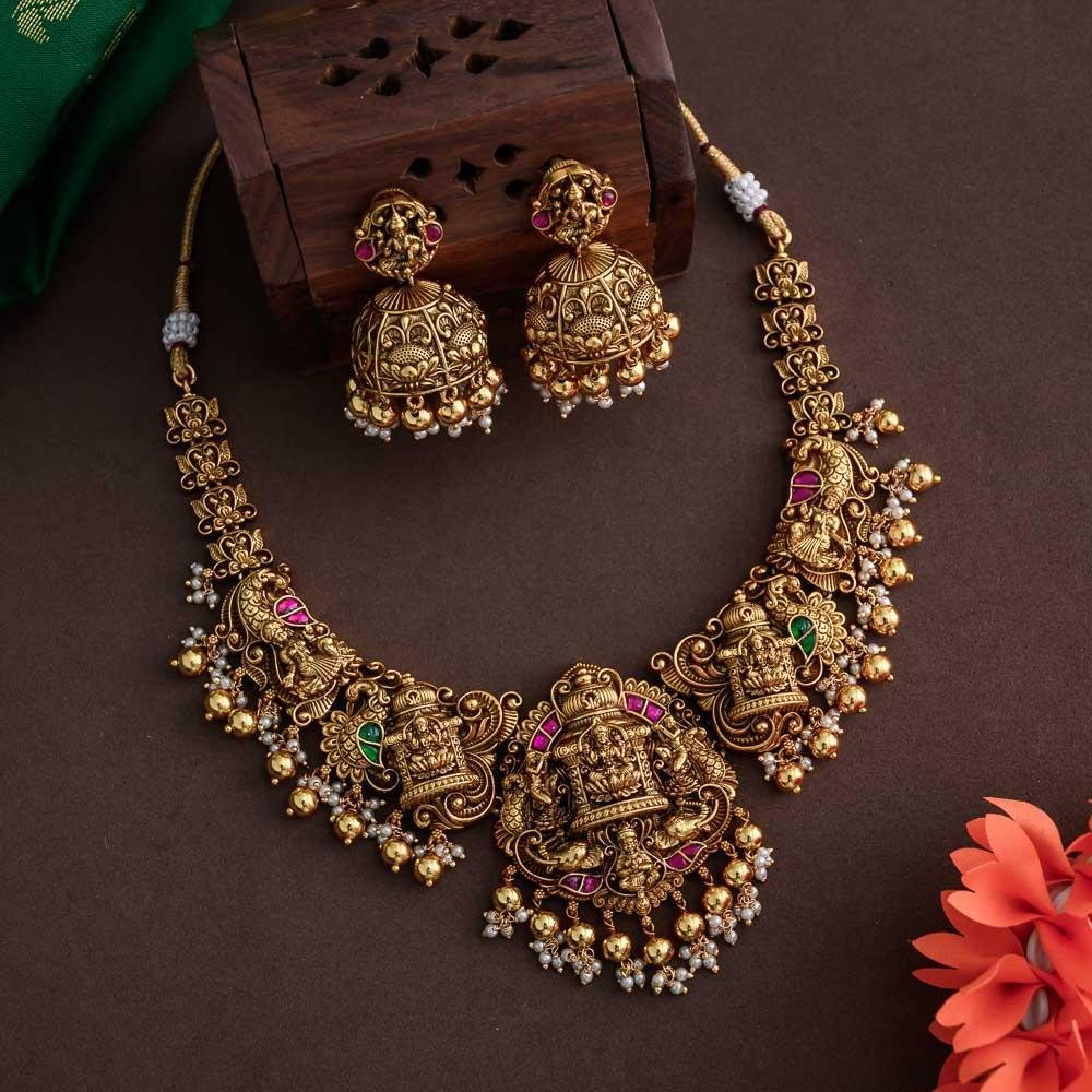 antique gold finished temple designer jadau stone worked 3d lakshmi and peacock desighned bold neckpiece set
