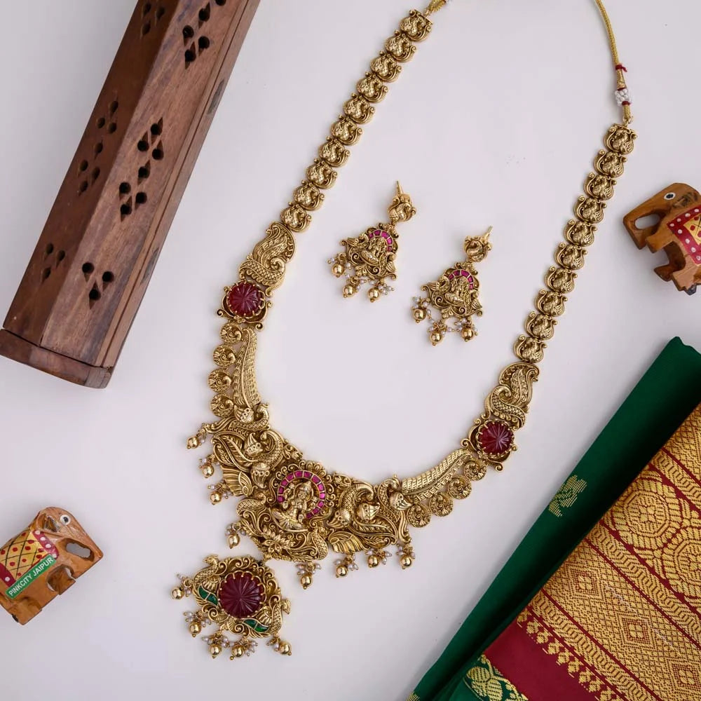 antique gold finished temple designer 3d worked real gold inspired premium jadau stone worked bridal haaram set