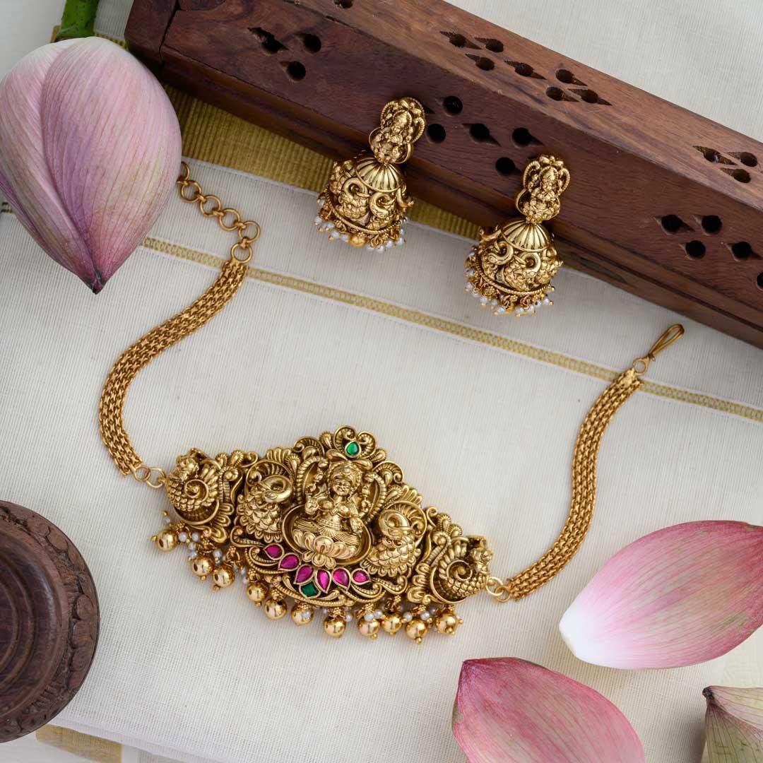 antique gold finished real gold inspired goddess lakshmi and peacock 3D pattern jadau exquisite stone worked statement choker set with bridal jhumkas