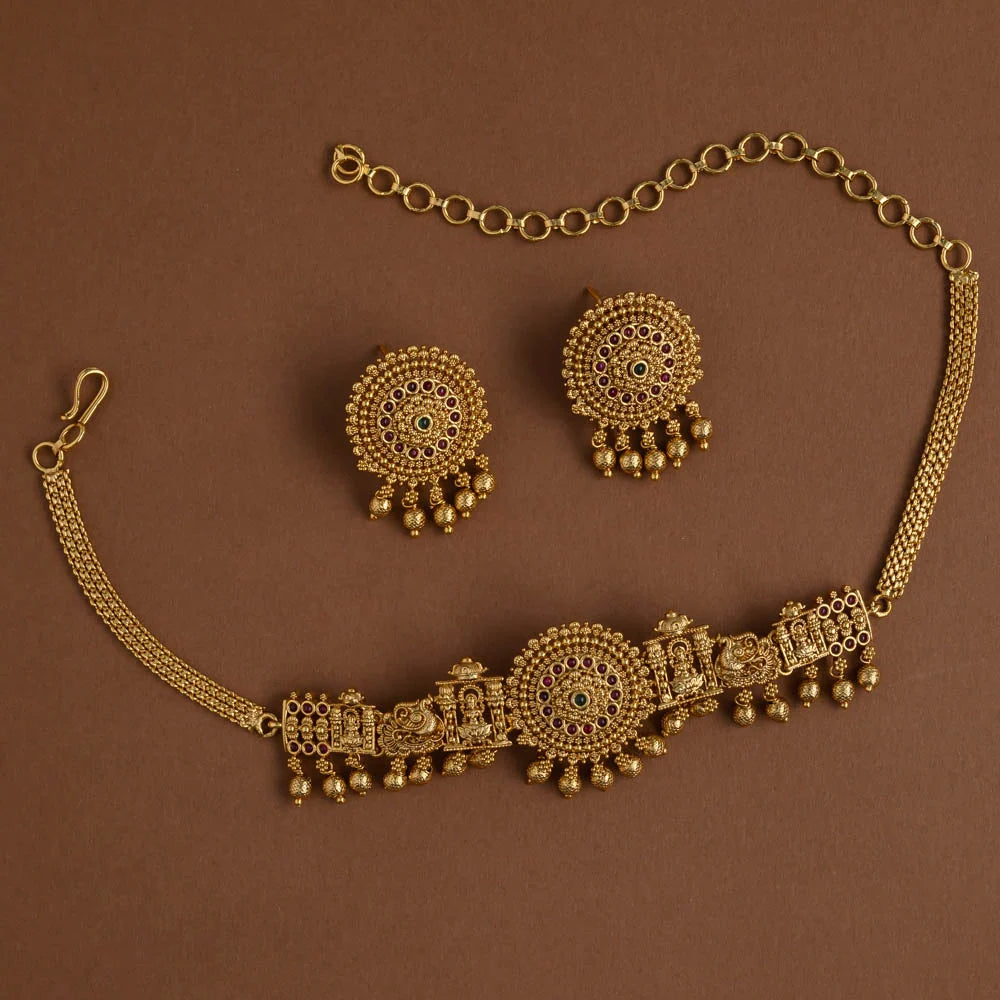 antique gold finished 3d temple designer neck hugging real gold inspired choker set comes with the bold earstud