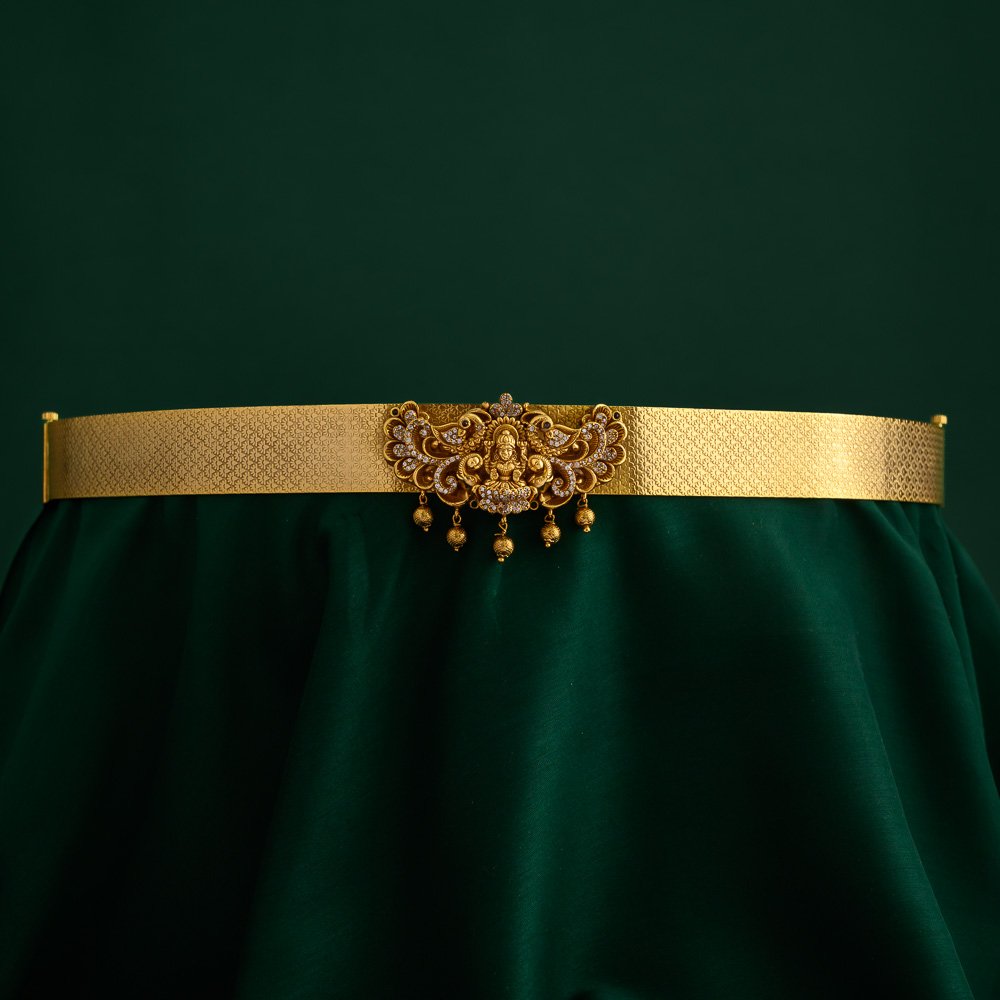antique gold finished temple designer goddess Lakshmi and peacock designed American diamond micro stone worked hipbelt