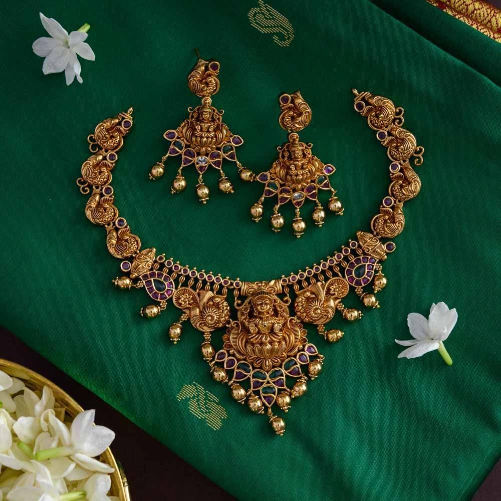 antique gold finished real gold inspired kemp stone worked nagas worked neck piece set with statment earring set