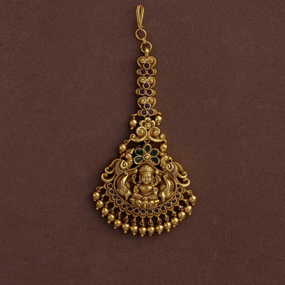 antique gold finished goddess lakshmi designed 3D pattern golden bead drop bridal temple designer tikka
