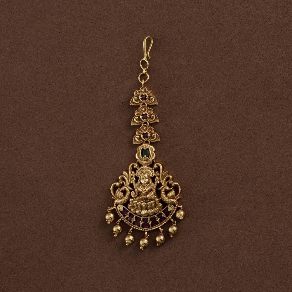 antique gold finished goddess lakshmi and floral designed nakshi tikka