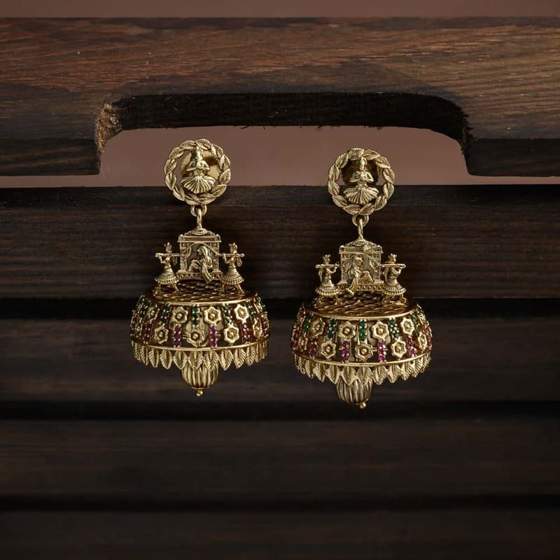 Antique gold finished ponniyin selvan nandhini devi pallakku wroked jhumka