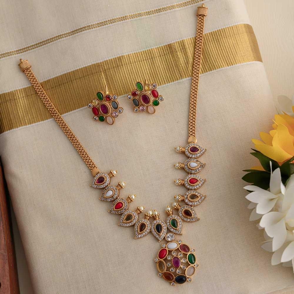Antique gold finished navarathana multi coloured stoned wroked attigai chain set