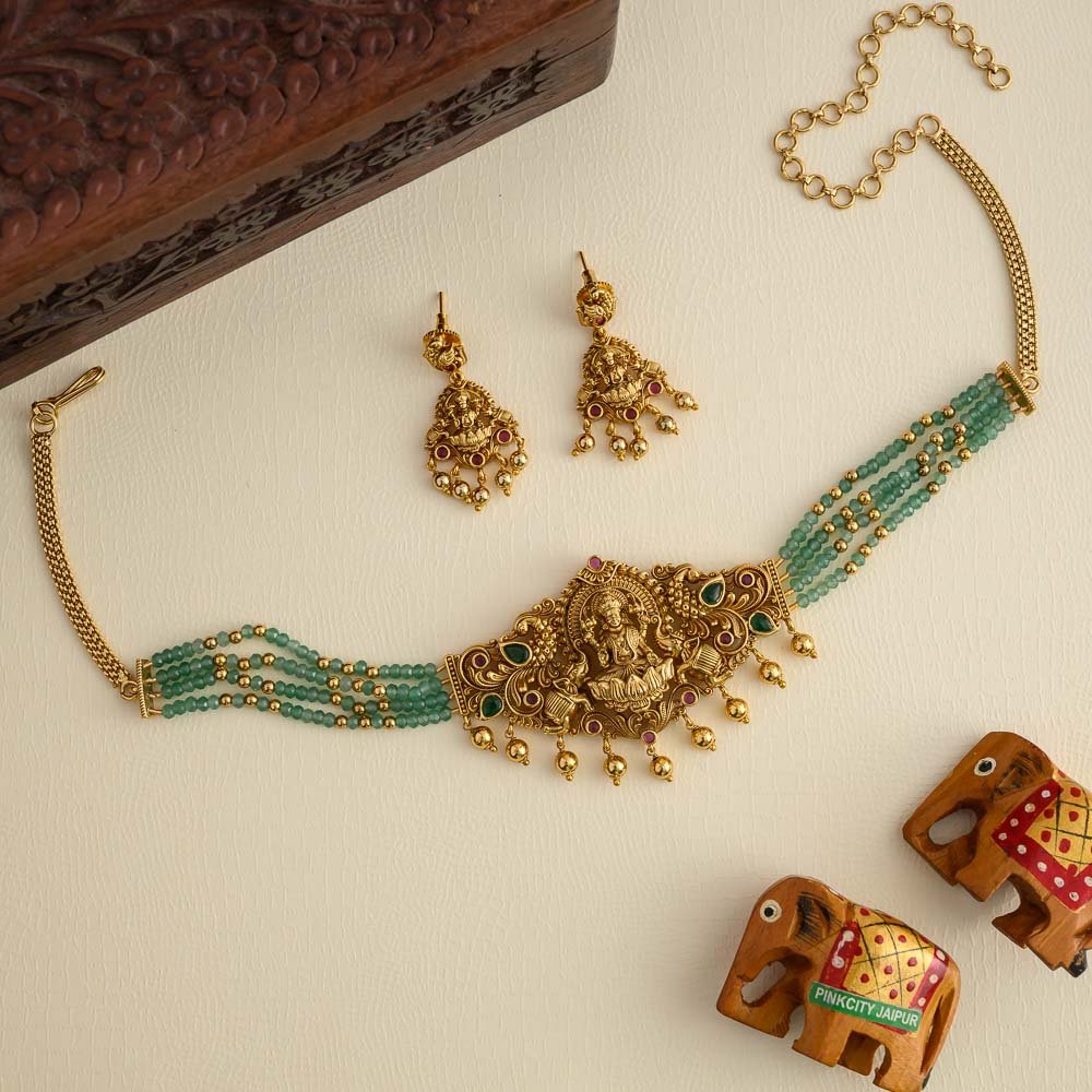 antique gold finished goddess lakshmi , elephant ,peacock designed temple designer four layered mint green agate beaded neck hugging statement choker