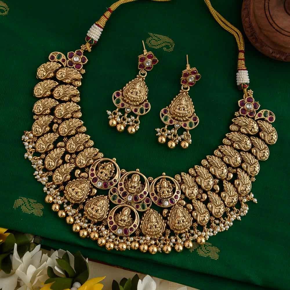 antique gold finished goddess Lakshmi and peacock designed real gold inspired kempu stone worked cluster pearl and beaded worked bold neckpiece set