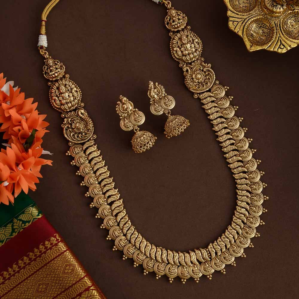 antique gold finished goddess lakshmi and peacock designed real gold inspired traditional bridal haaram set comes with the jhumies