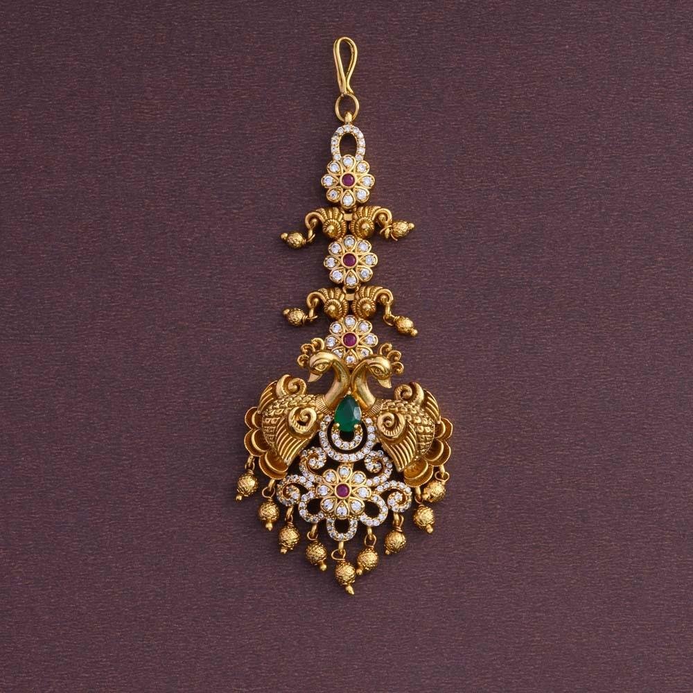 antique gold finished peacock designed 3D floral heavy stone worked tikka