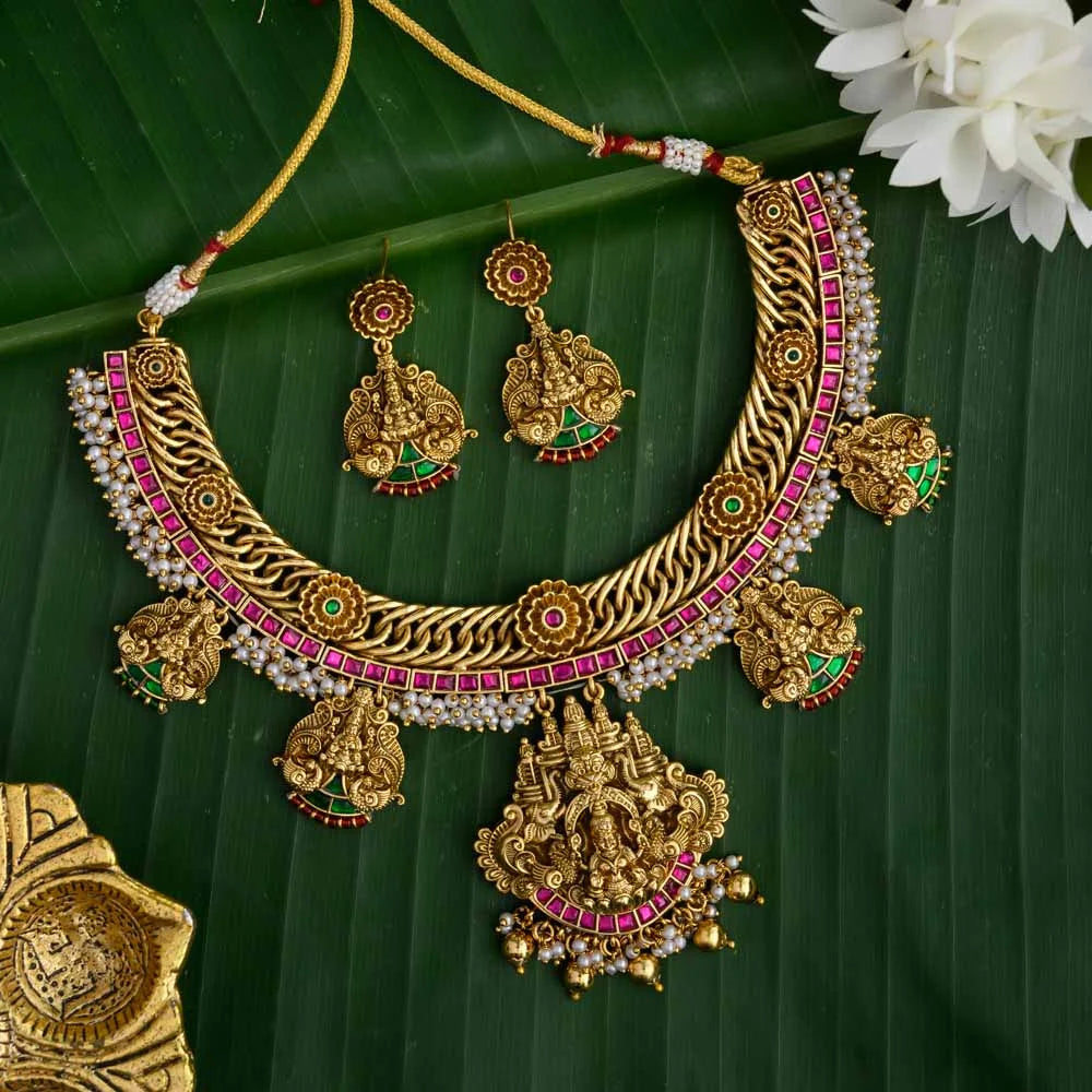 antique gold finished premium jadau stone worked temple designer cluster pearl worked neckpiece set