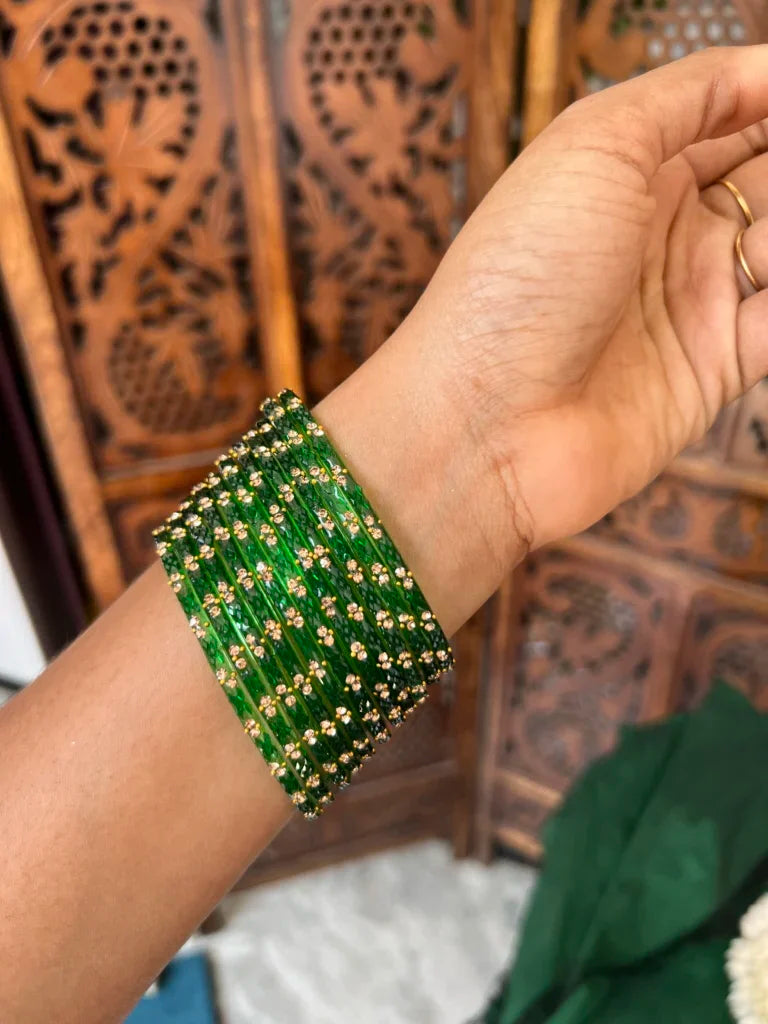 Crafted with precision, our handmade glass bangles blend tradition with elegance. Featuring vibrant hues, intricate patterns, and a smooth finish, they add a timeless charm to any look. Perfect for festive, bridal wear