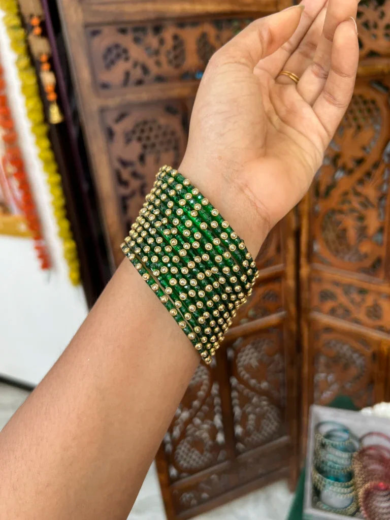 Crafted with precision, our handmade glass bangles blend tradition with elegance. Featuring vibrant hues, intricate patterns, and a smooth finish, they add a timeless charm to any look. Perfect for festive, bridal wear