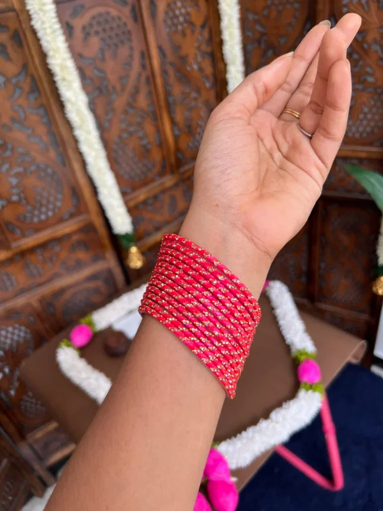 Crafted with precision, our handmade glass bangles blend tradition with elegance. Featuring vibrant hues, intricate patterns, and a smooth finish, they add a timeless charm to any look. Perfect for festive, bridal wear