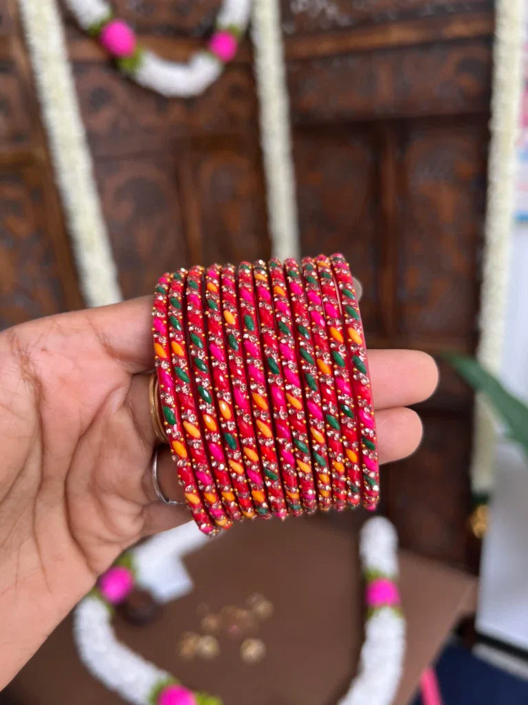 Crafted with precision, our handmade glass bangles blend tradition with elegance. Featuring vibrant hues, intricate patterns, and a smooth finish, they add a timeless charm to any look. Perfect for festive, bridal wear