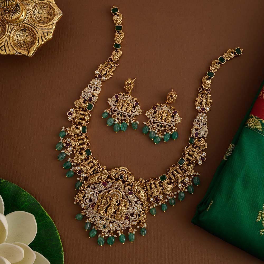 antique gold finished temple designer real gold inspired ram parivar 3d and exquisite stone worked heavy bridal haaram comes with the statement earrings